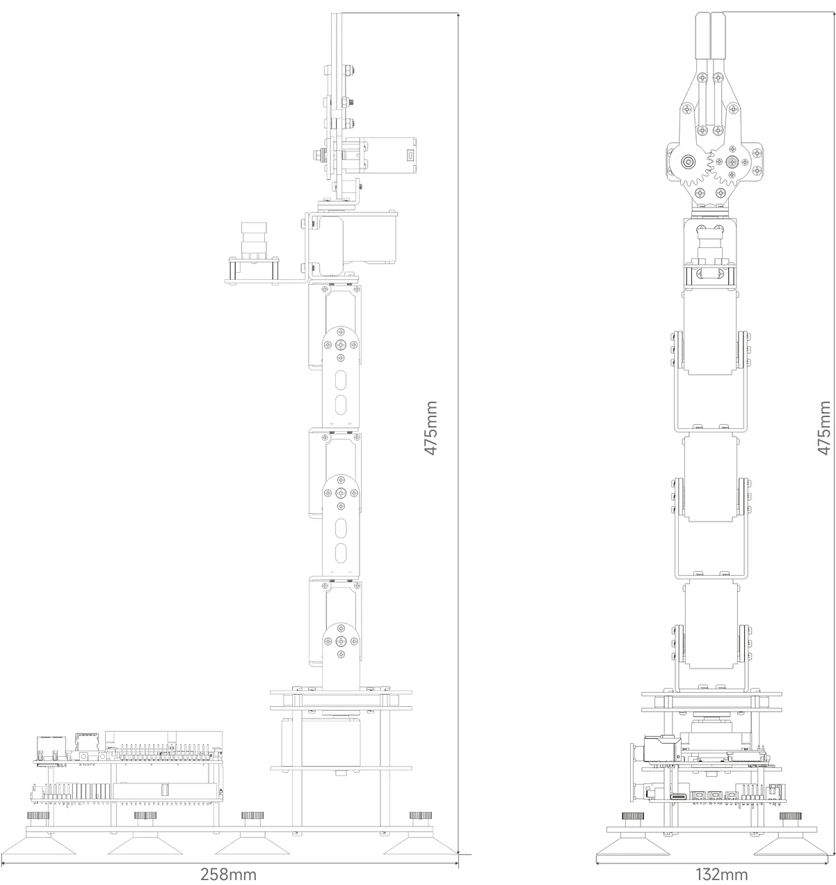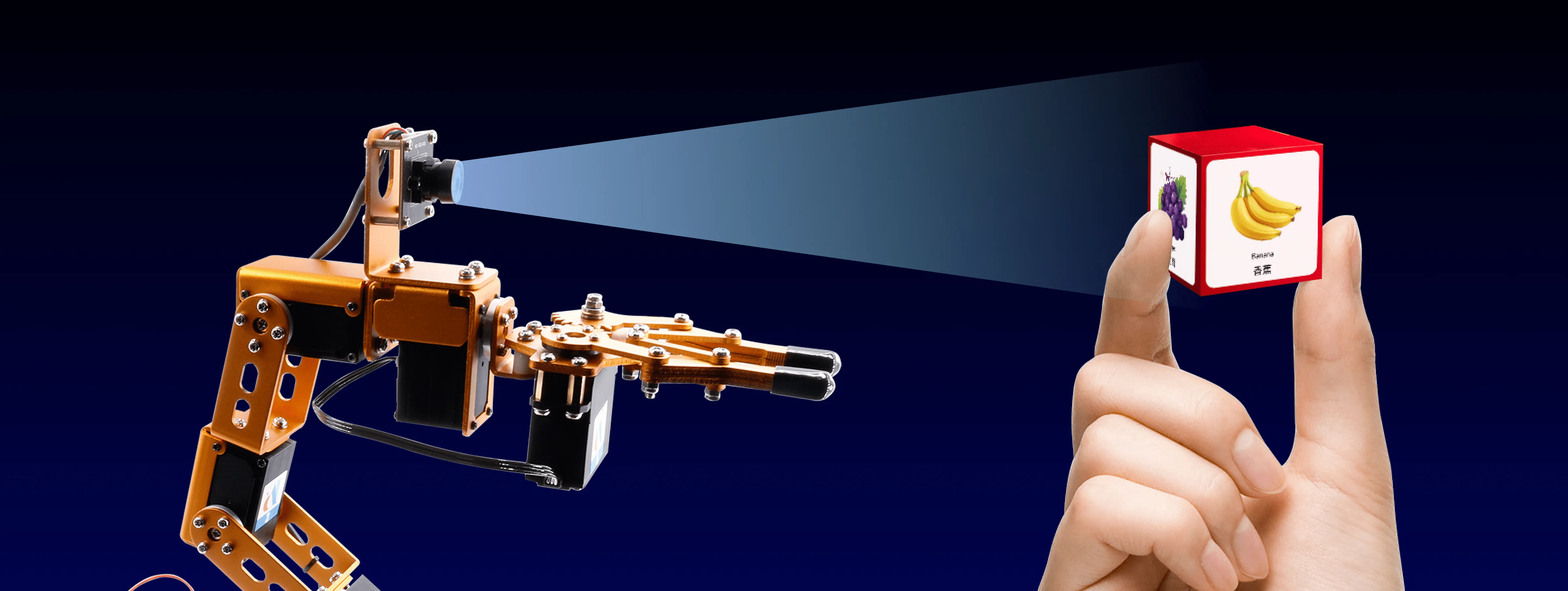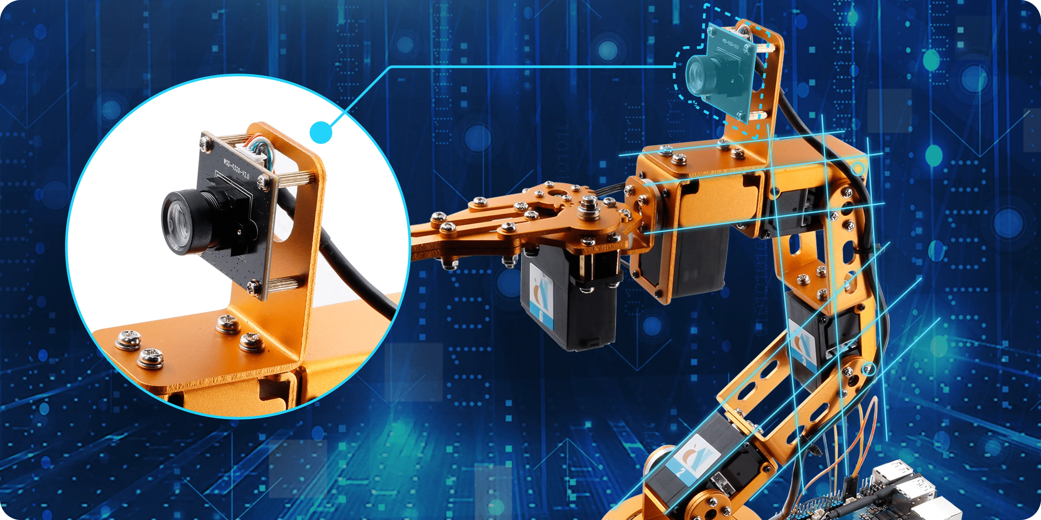 搭载一个6自由度机械臂,可以轻松抓取和分拣目标物品。搭载USB摄像头,眼随手动,手眼合一。