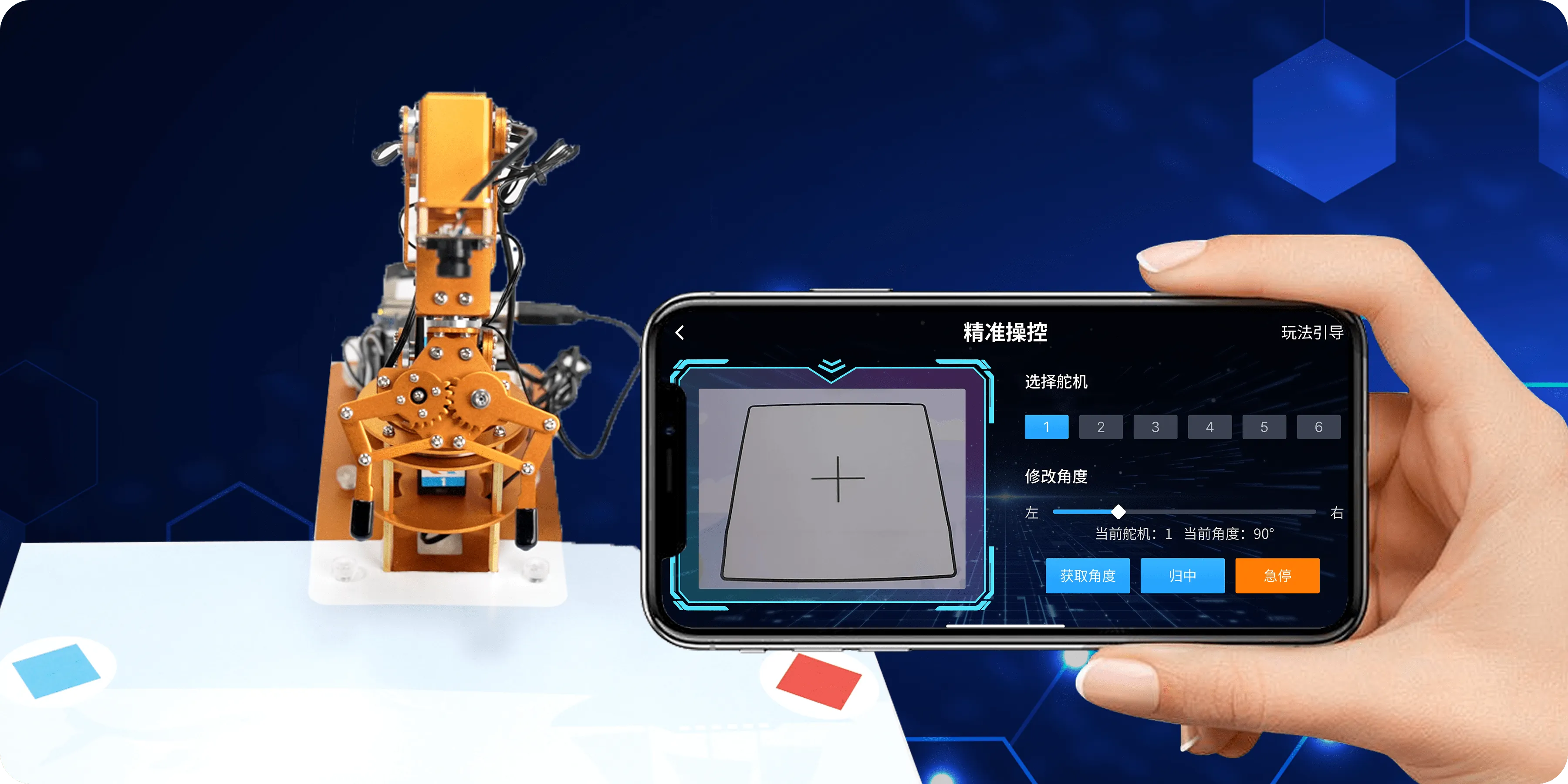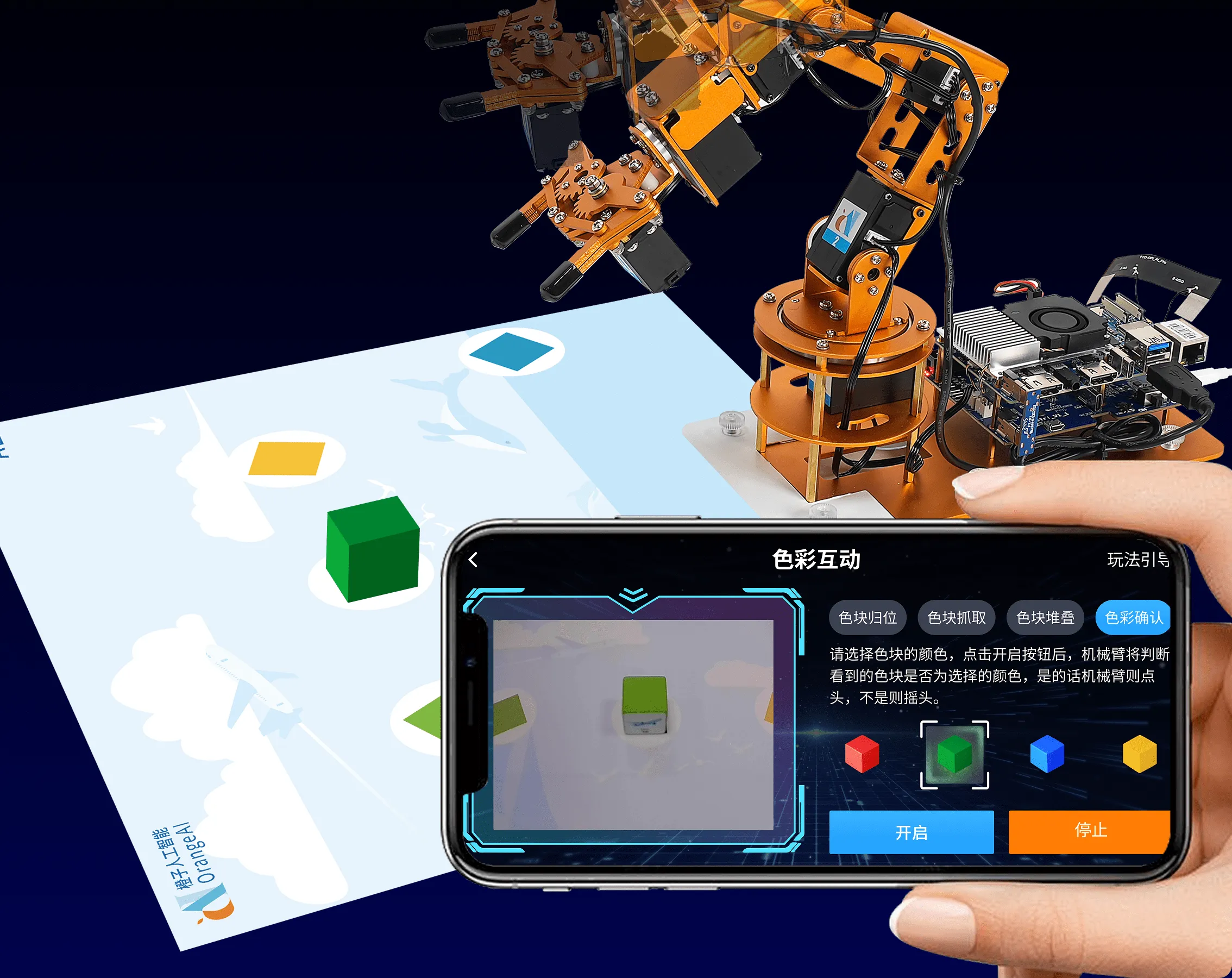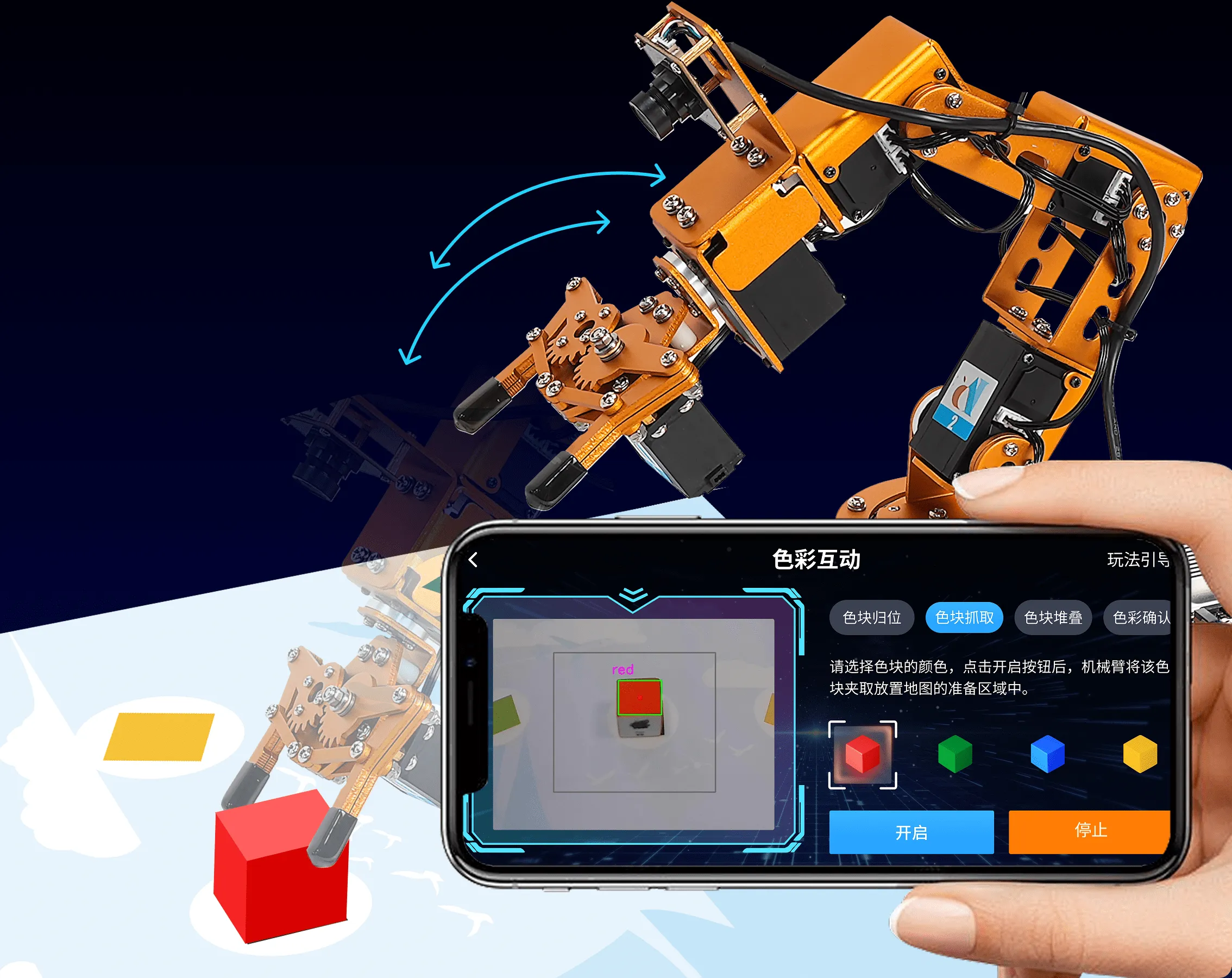 识别用户放在准备区域的积木的颜色,如果是用户在App端选择的颜色,机械臂将点头确认,如果不是则会摇头