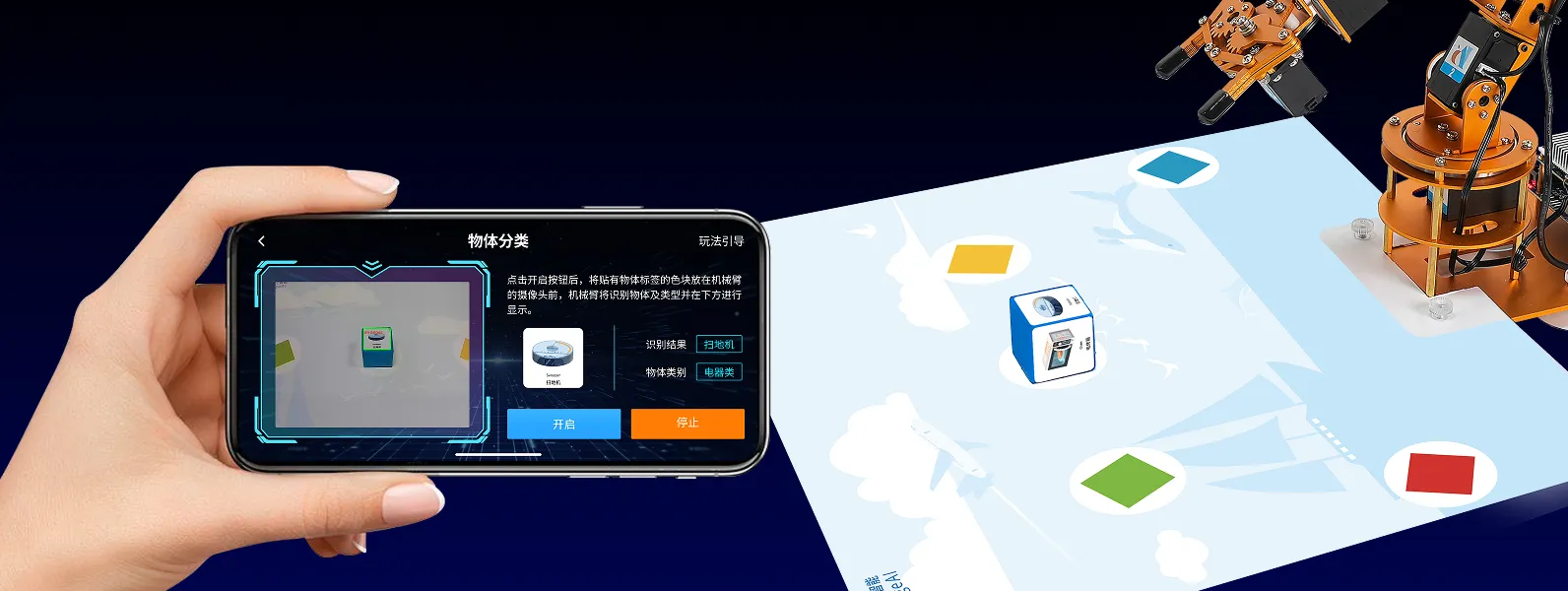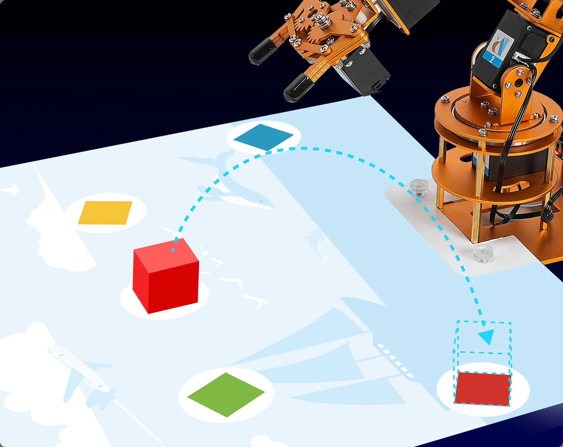 以OpenCV为图像处理库,利用USB摄像头对目标物品进行颜色识别和坐标定位,实现智能物体分拣、目标追踪等人工智能操作。