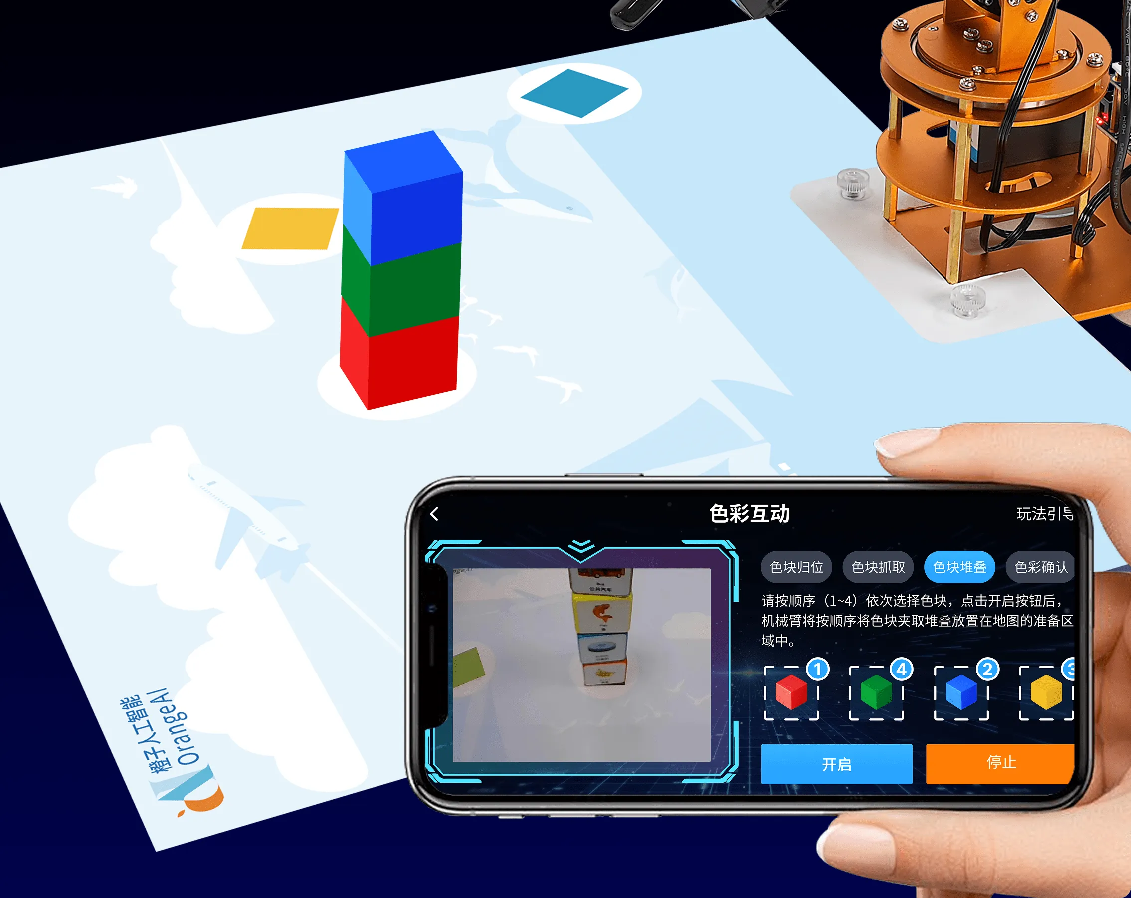 按照APP上设置颜色的抓取顺序将对应的积木抓取至准备区域并堆叠