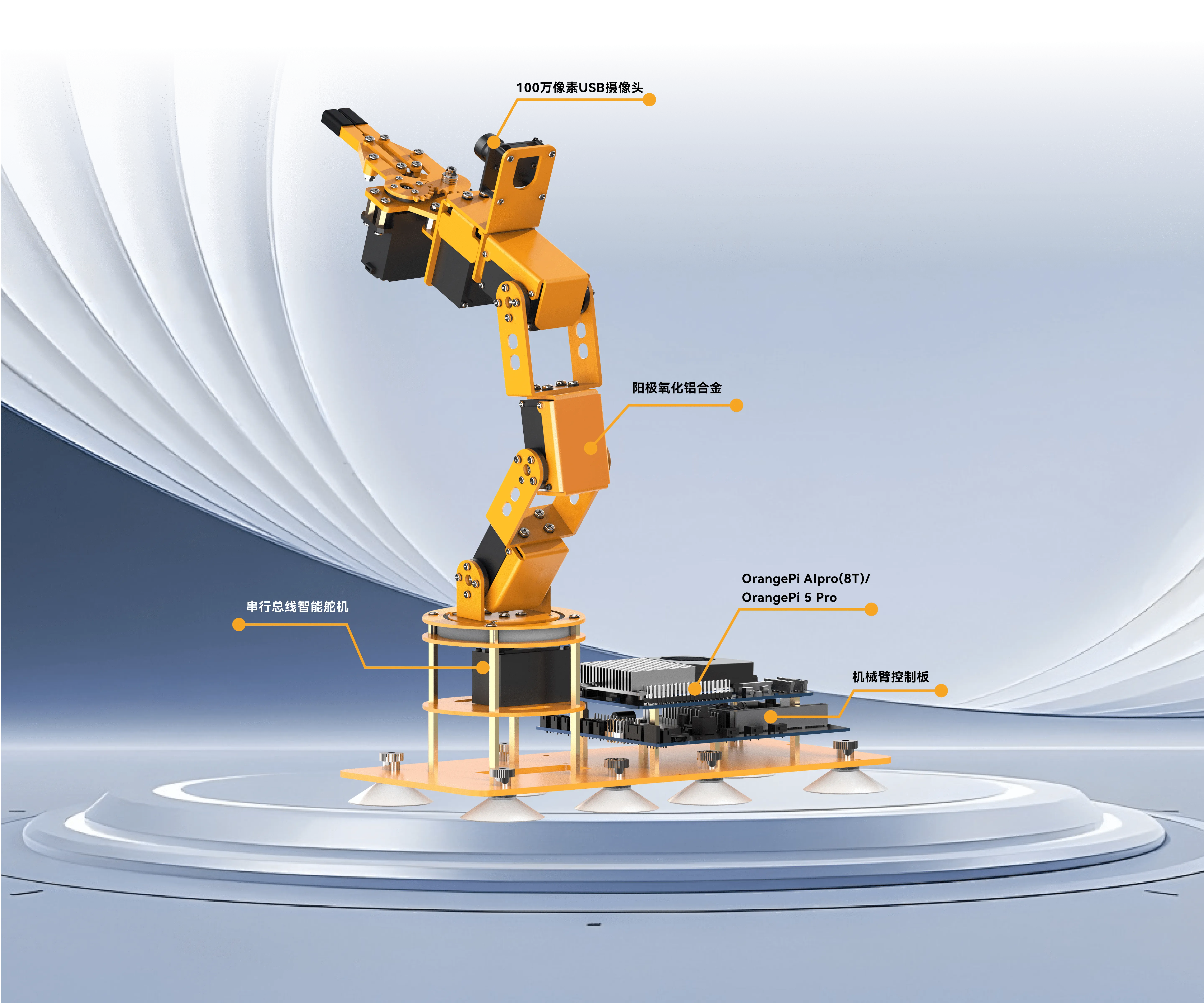OrangeAI智能视觉机械臂以OrangePi AIpro(8T)/OrangePi 5 Pro为主控,搭载USB摄像头,能实现颜色识别、智能物体分栋、目标追踪等功能。通过ROS2机器人操控系统,为机器人开发提供跨平台、跨语言的开发环境。